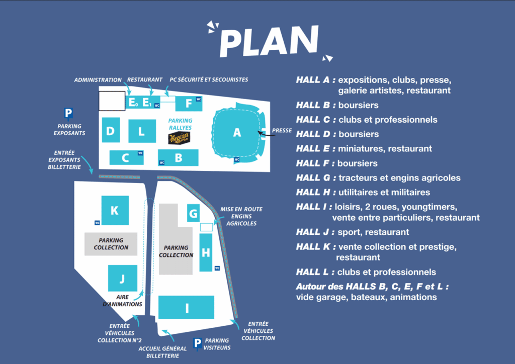 - Parking Collection : Situé dans l’enceinte du parc Expo, son accès est réservé aux véhicules anciens et de prestige, dans la limite des places disponibles. Les chauffeurs et les passagers doivent être munis de leur billet d’entrée pour le salon. Le nouveau sens de circulation mis en place en 2025 est maintenu. Il est IMPERATIF de suivre les panneaux de signalisation ! Accès par rond-point CourtePaille et rejoindre la partie Nord du Parc des Expositions. Selon le plan vigipirate en vigueur des contrôles auront lieu avant votre accès au site. Nous nous excusons pour la gêne occasionnée et nous vous remercions pour votre compréhension.